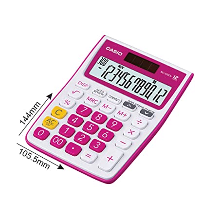 The Casio MJ-12VCb-RD is a 12-digit desktop calculator with a 300-step check and correct function. It has a large, extra-large display that makes it easy to read numbers, and it also features a localized number display that can be switched between English and other languages. The calculator has UV-coated durable keys that are resistant to fading and wear, and it also features a key rollover function that allows you to enter multiple numbers quickly without having to press the equals sign each time. The MJ-12VCb-RD is powered by solar energy and batteries, so you can use it anywhere, even in low-light conditions. It is available in a variety of colors, including red, white, and pink.